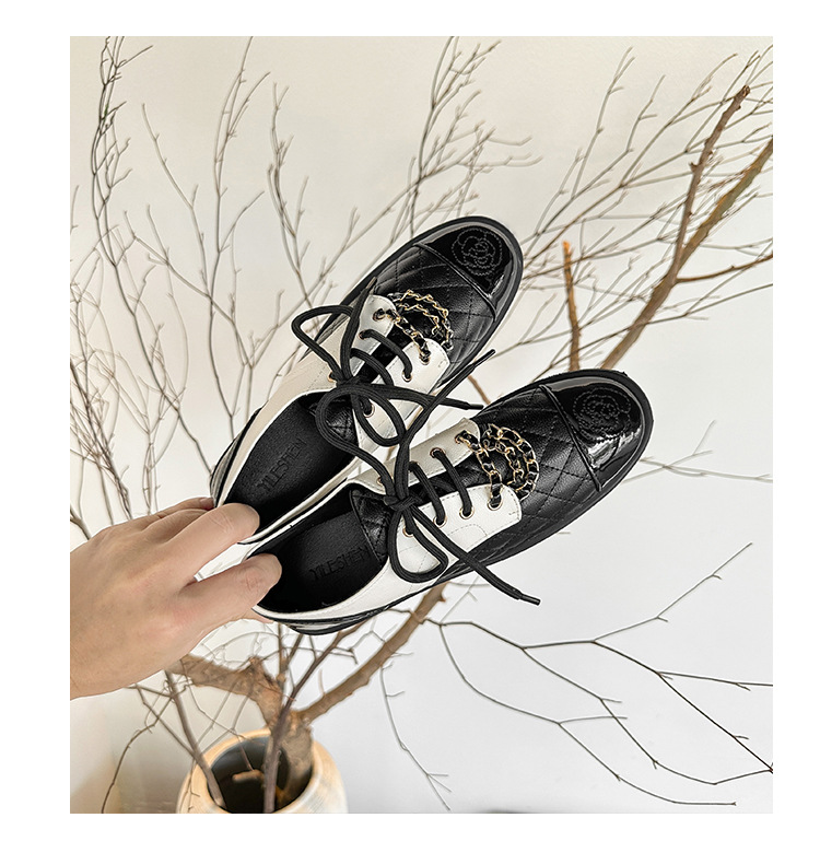 小香风菱格平底单鞋女新款春秋新款山茶花链条拼色英伦小皮鞋