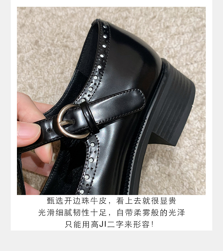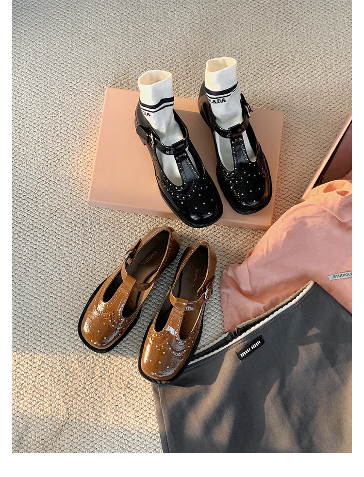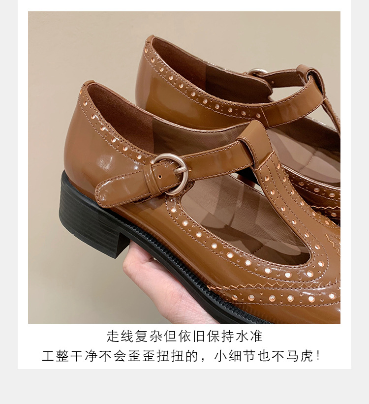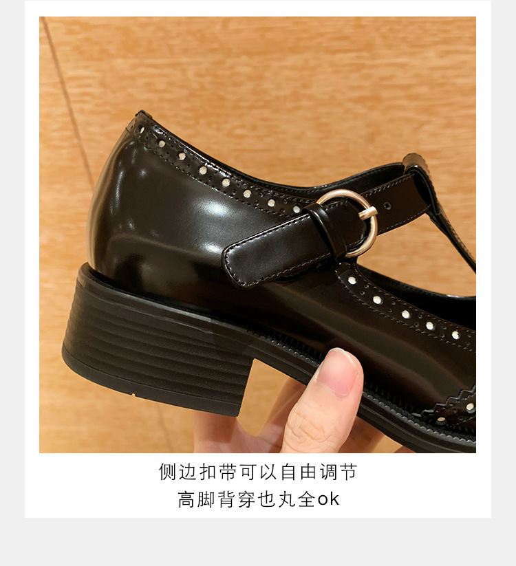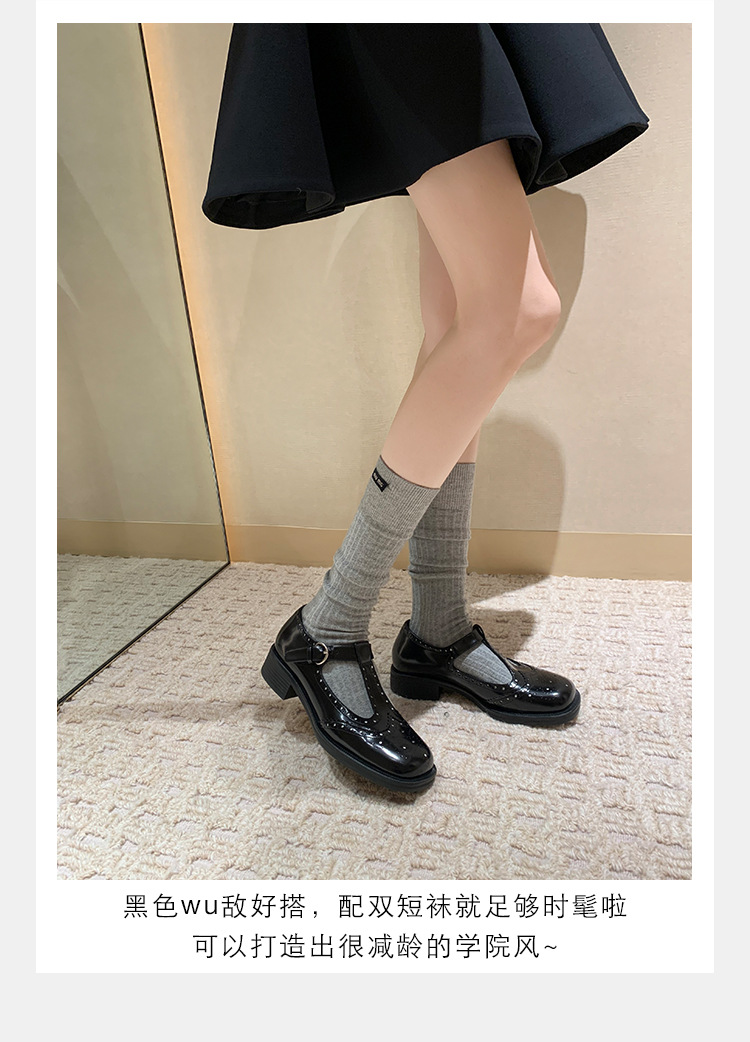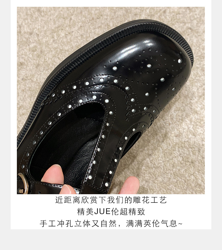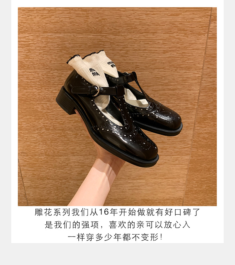 葡萄妈同款布洛克雕花T字带真皮英伦风玛丽珍小皮鞋