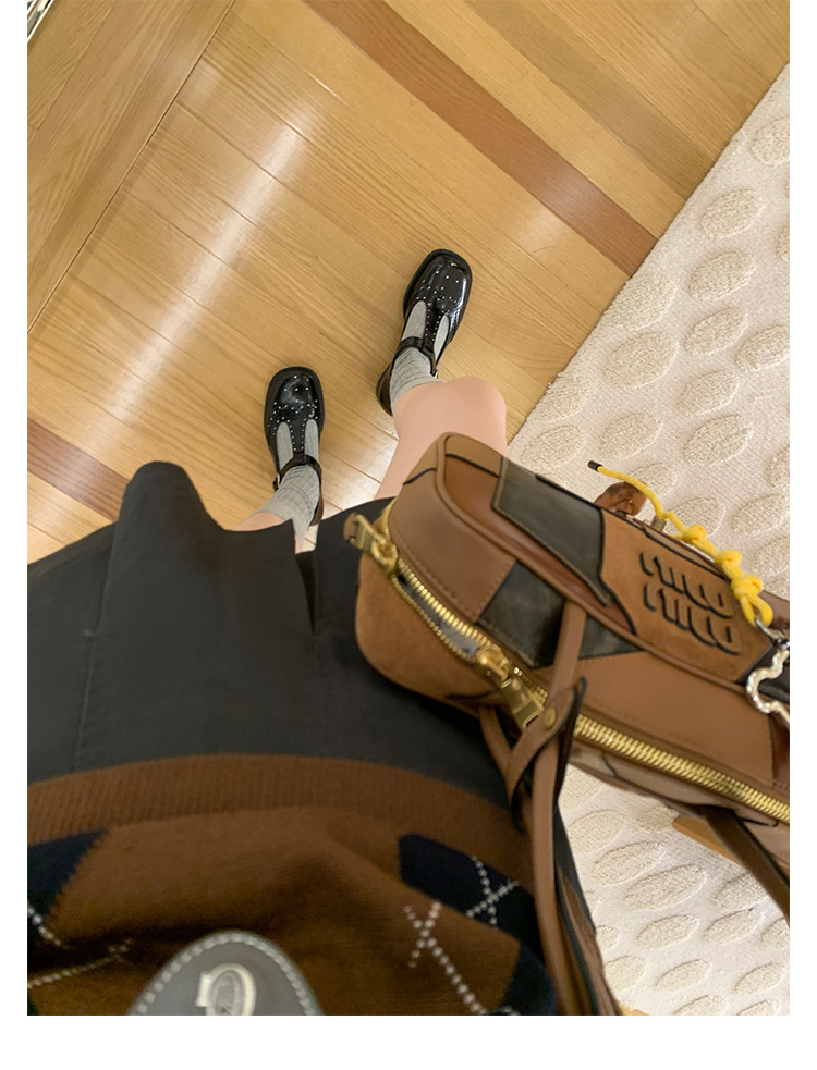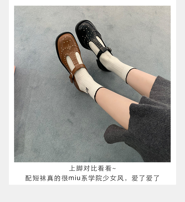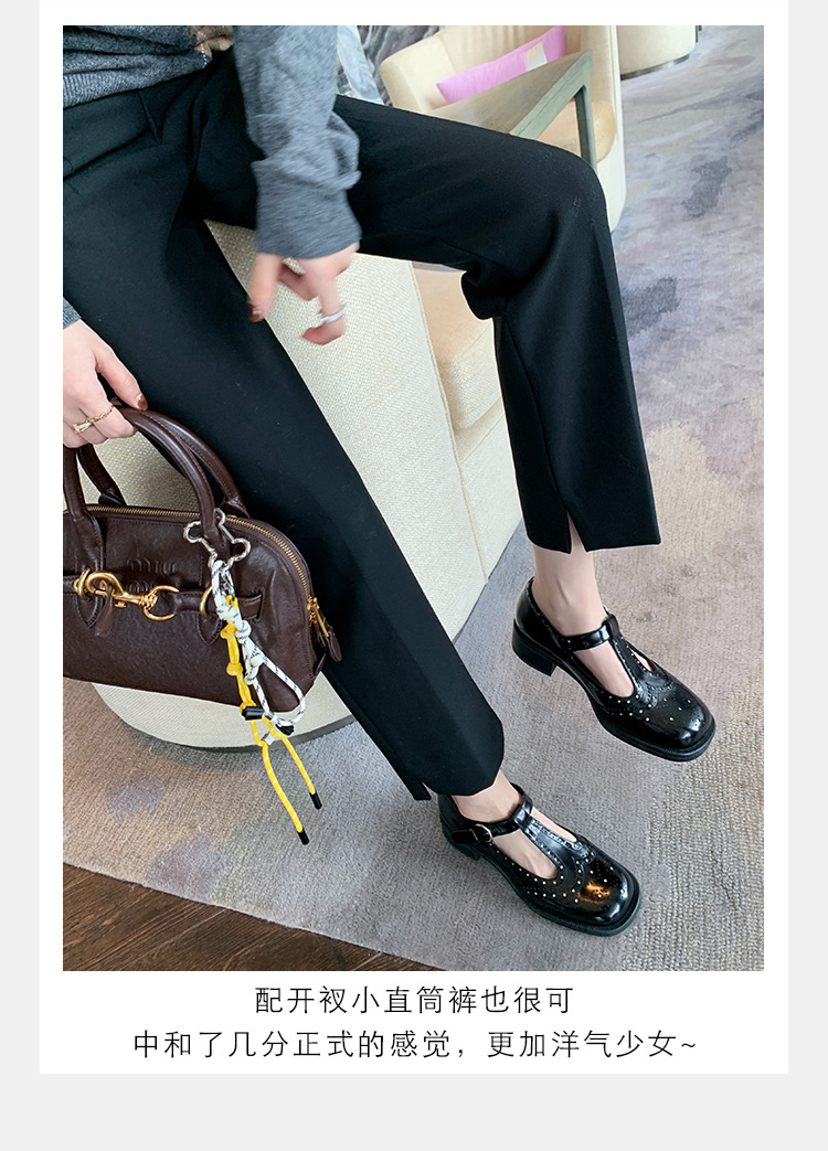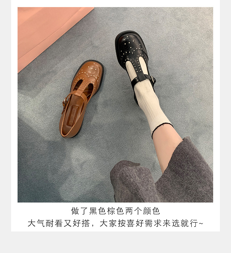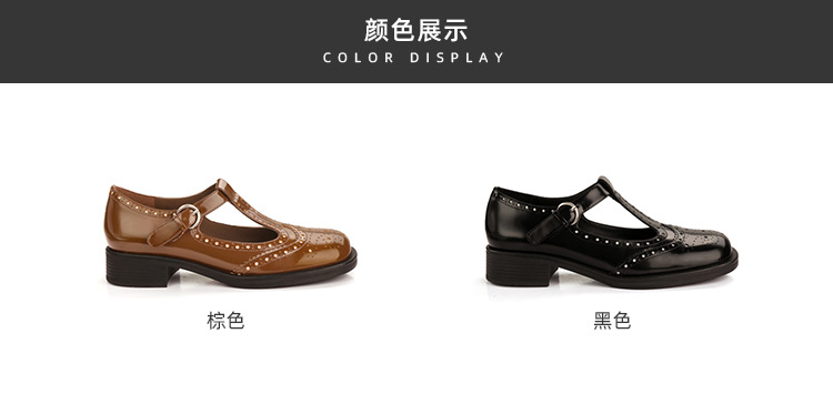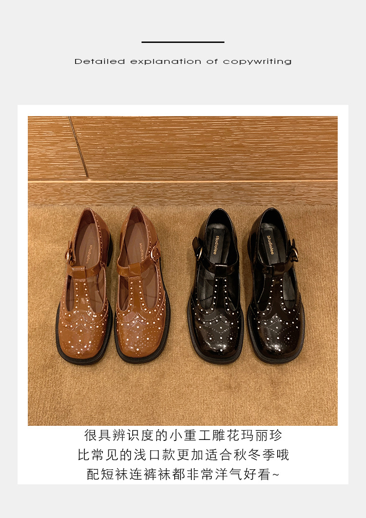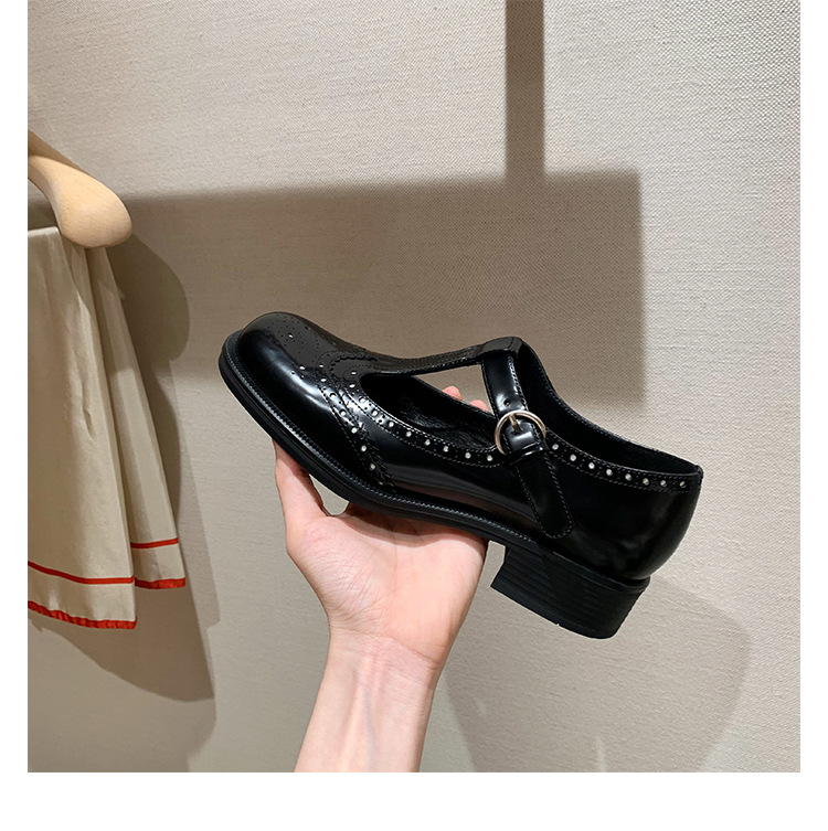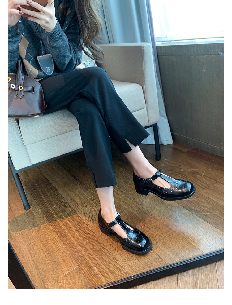 葡萄妈同款布洛克雕花T字带真皮英伦风玛丽珍小皮鞋