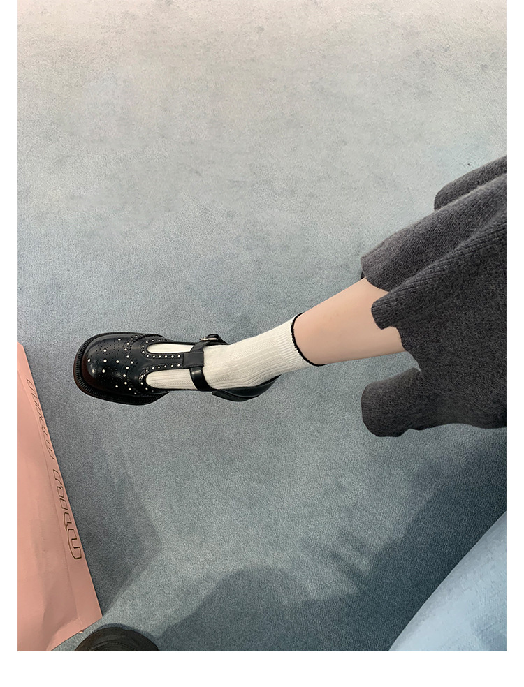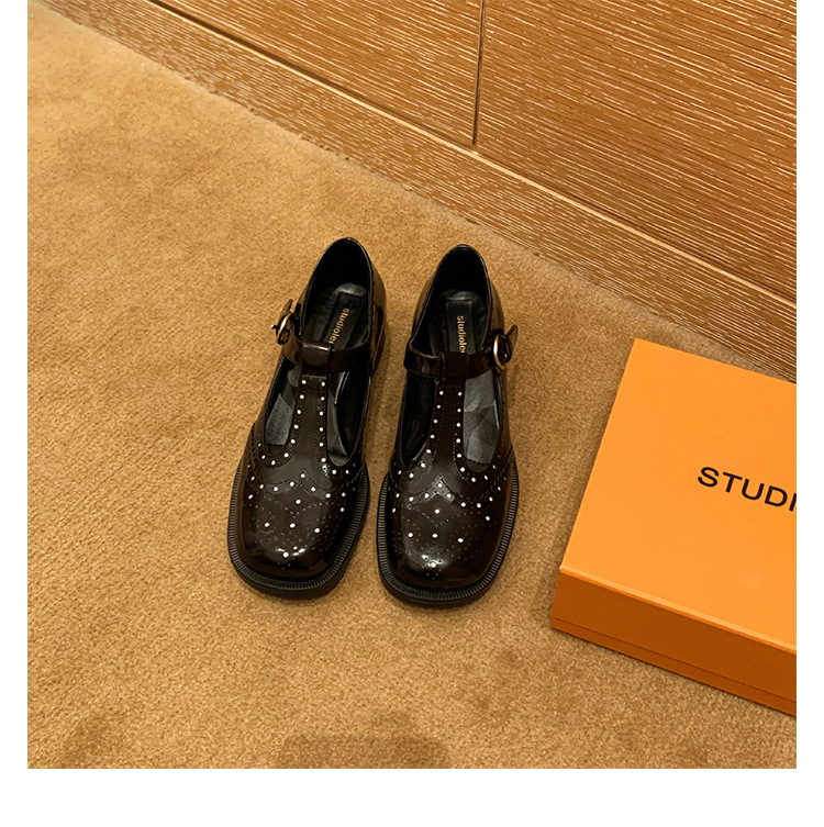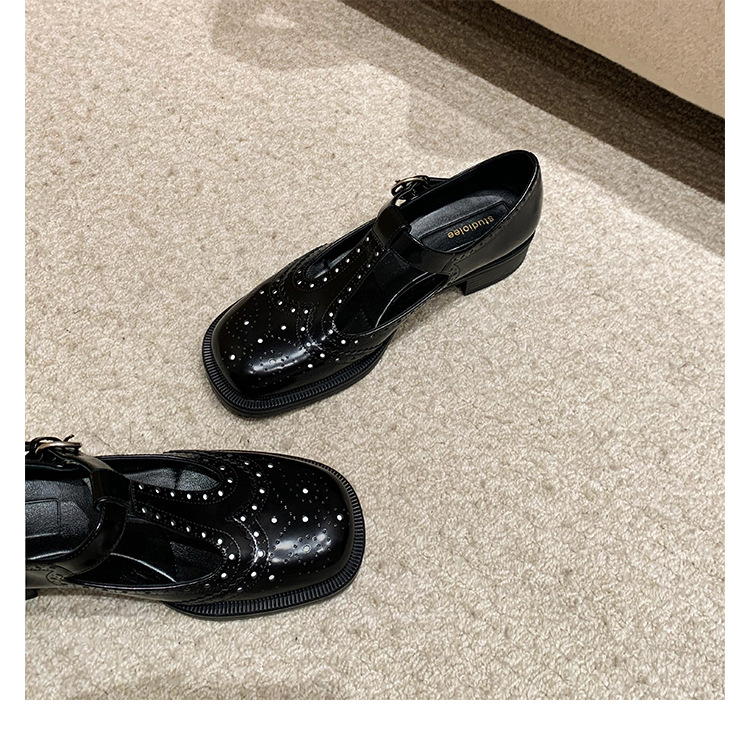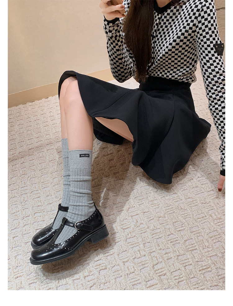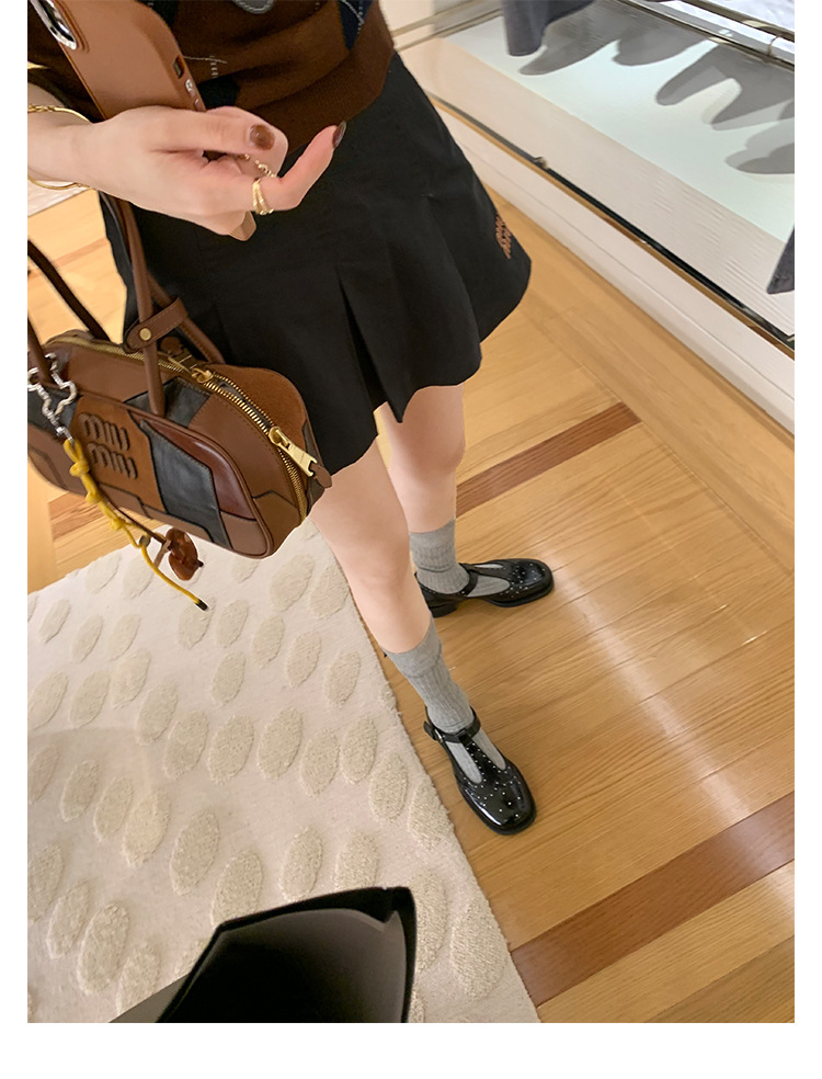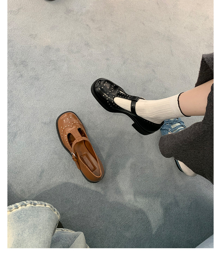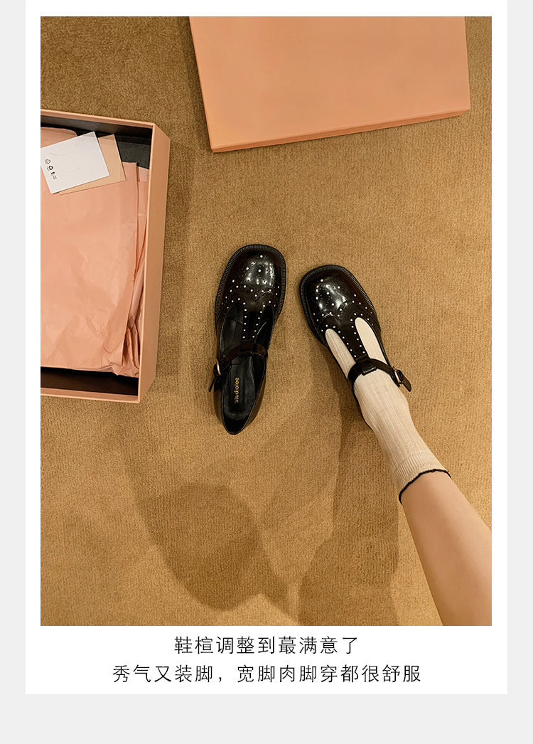 葡萄妈同款布洛克雕花T字带真皮英伦风玛丽珍小皮鞋