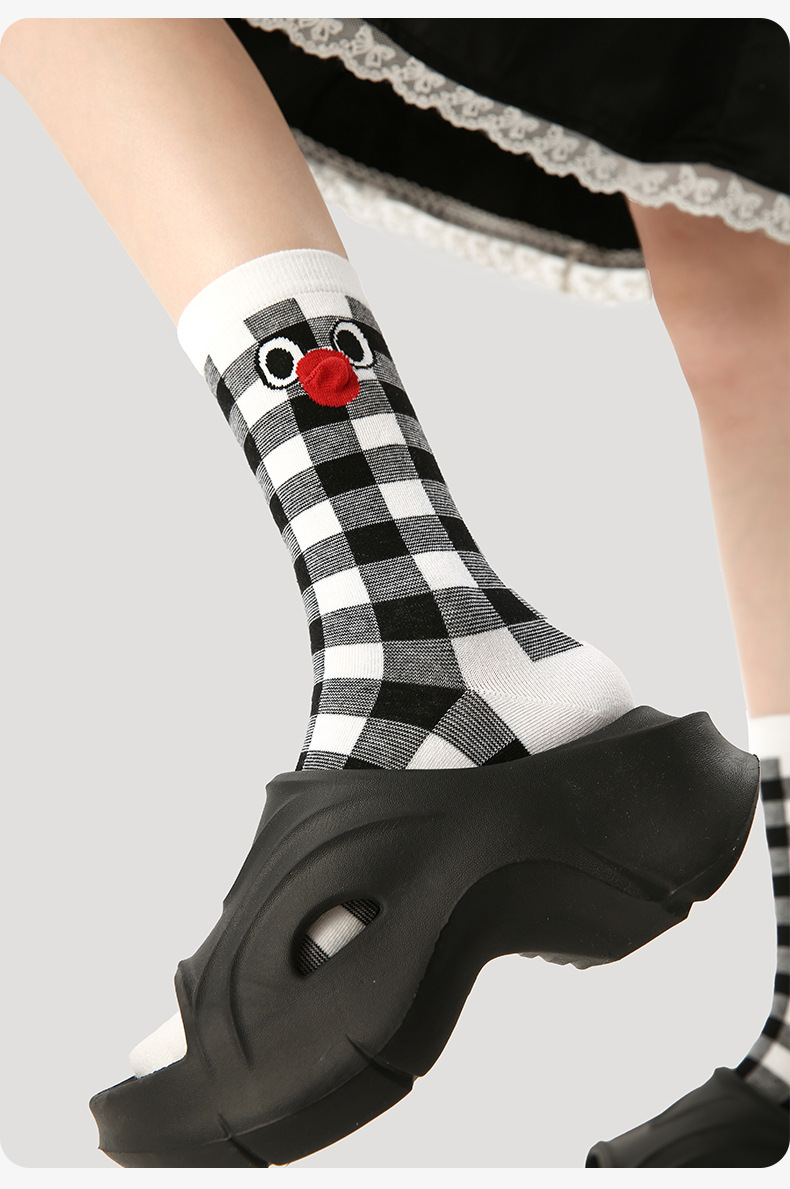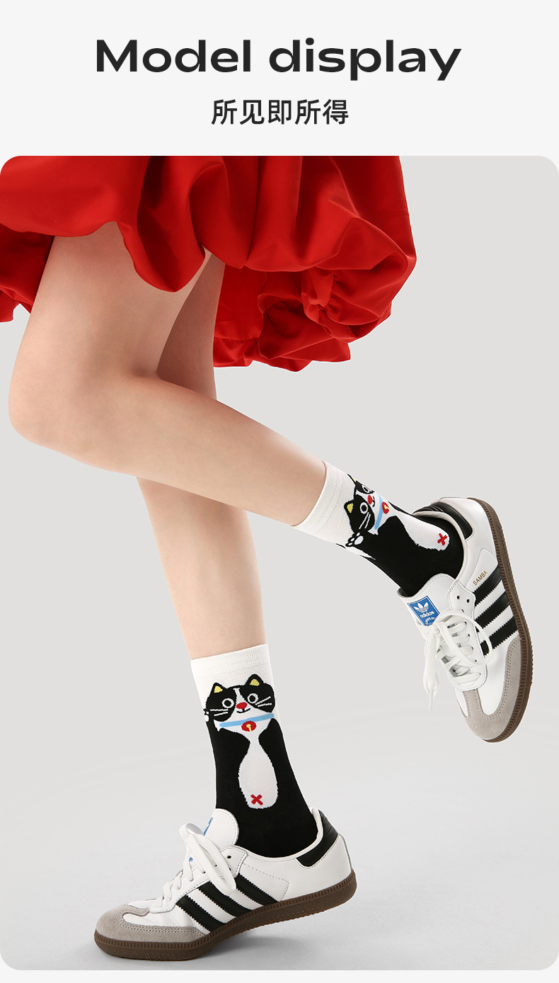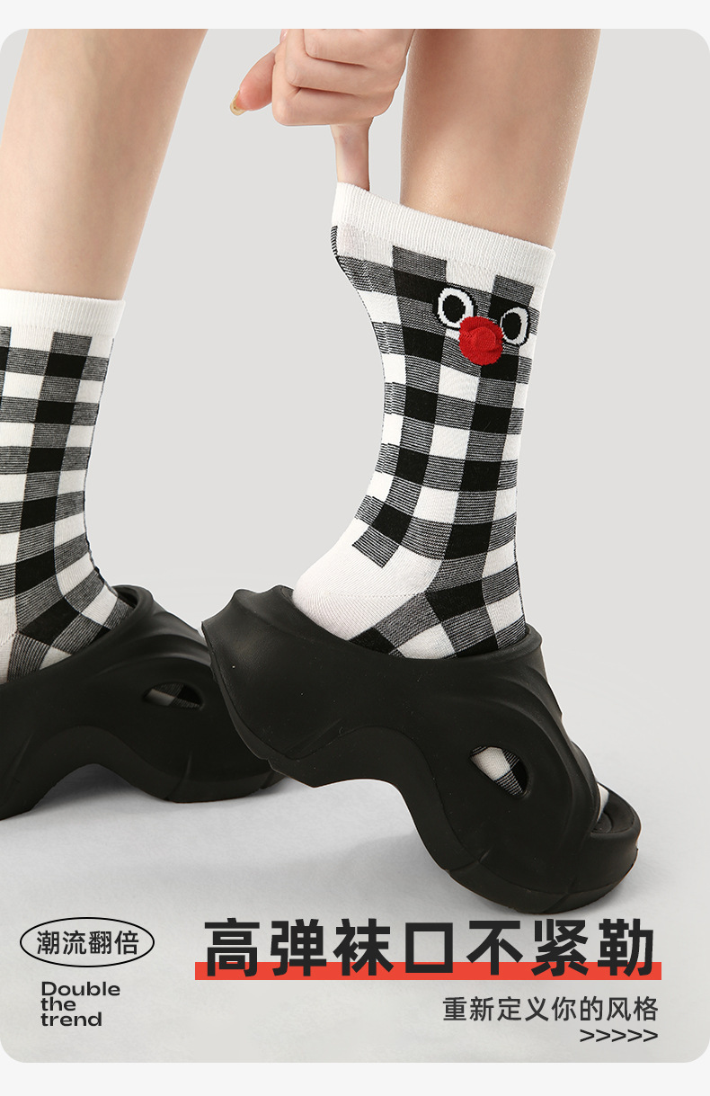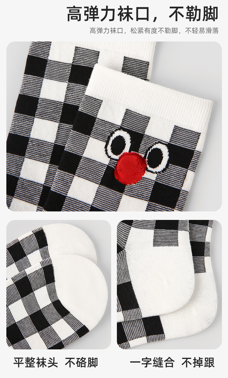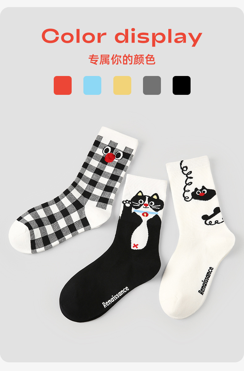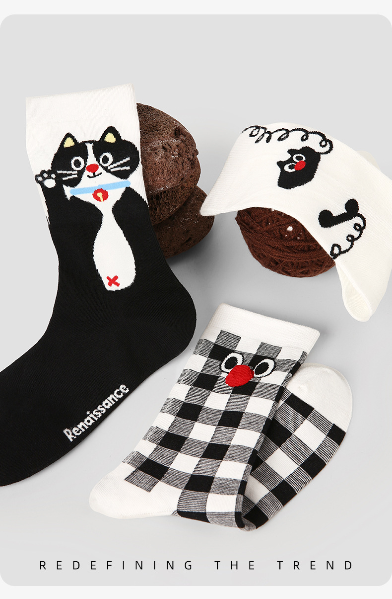 原创女袜春夏季黑白格子中筒袜卡通猫咪精梳棉袜子女