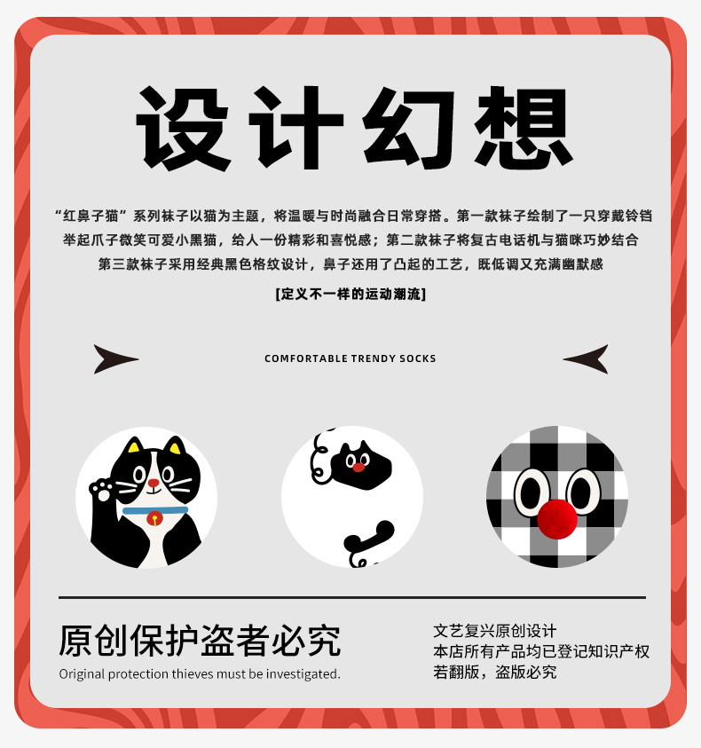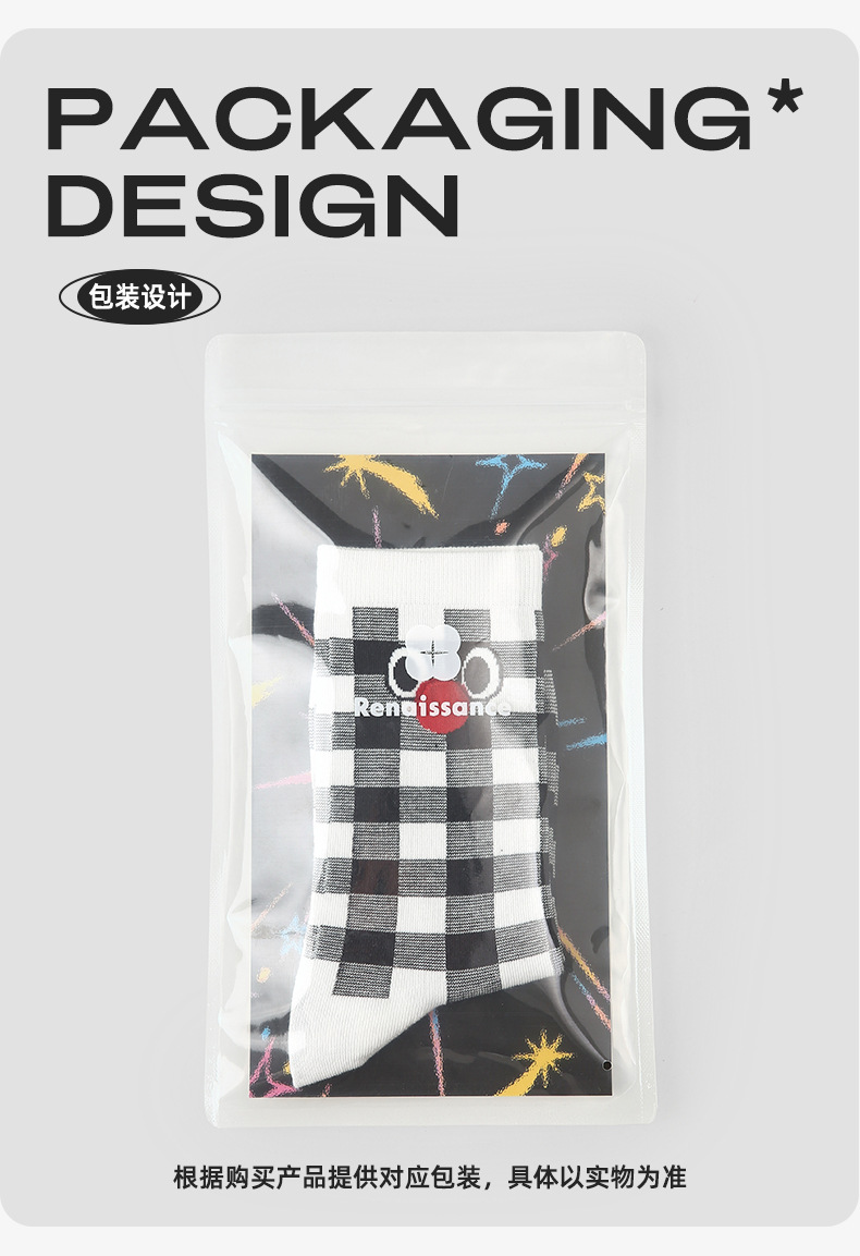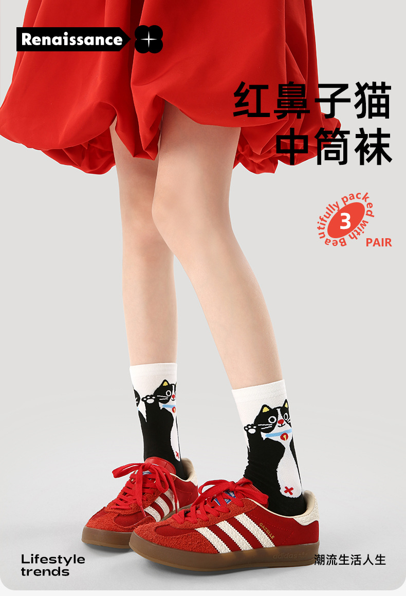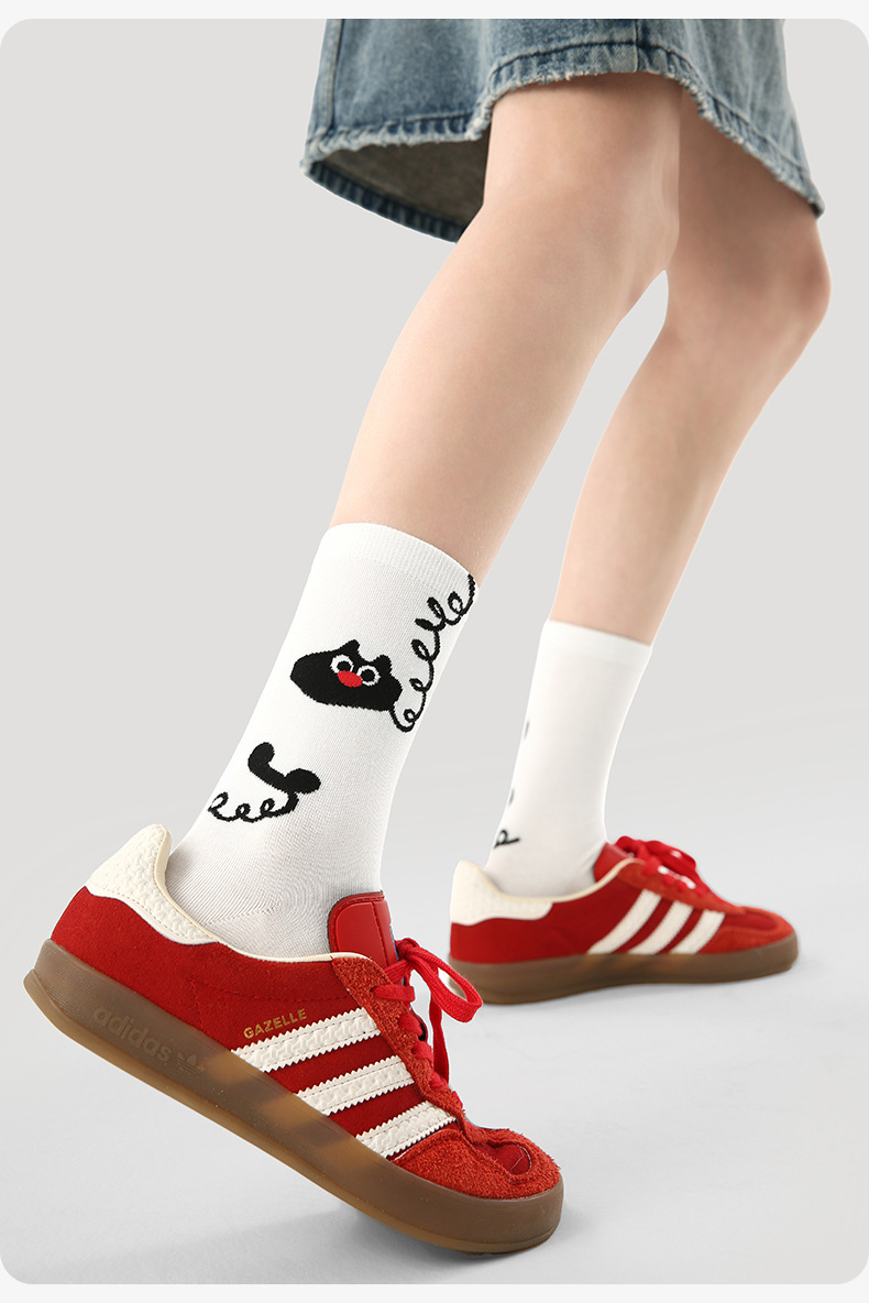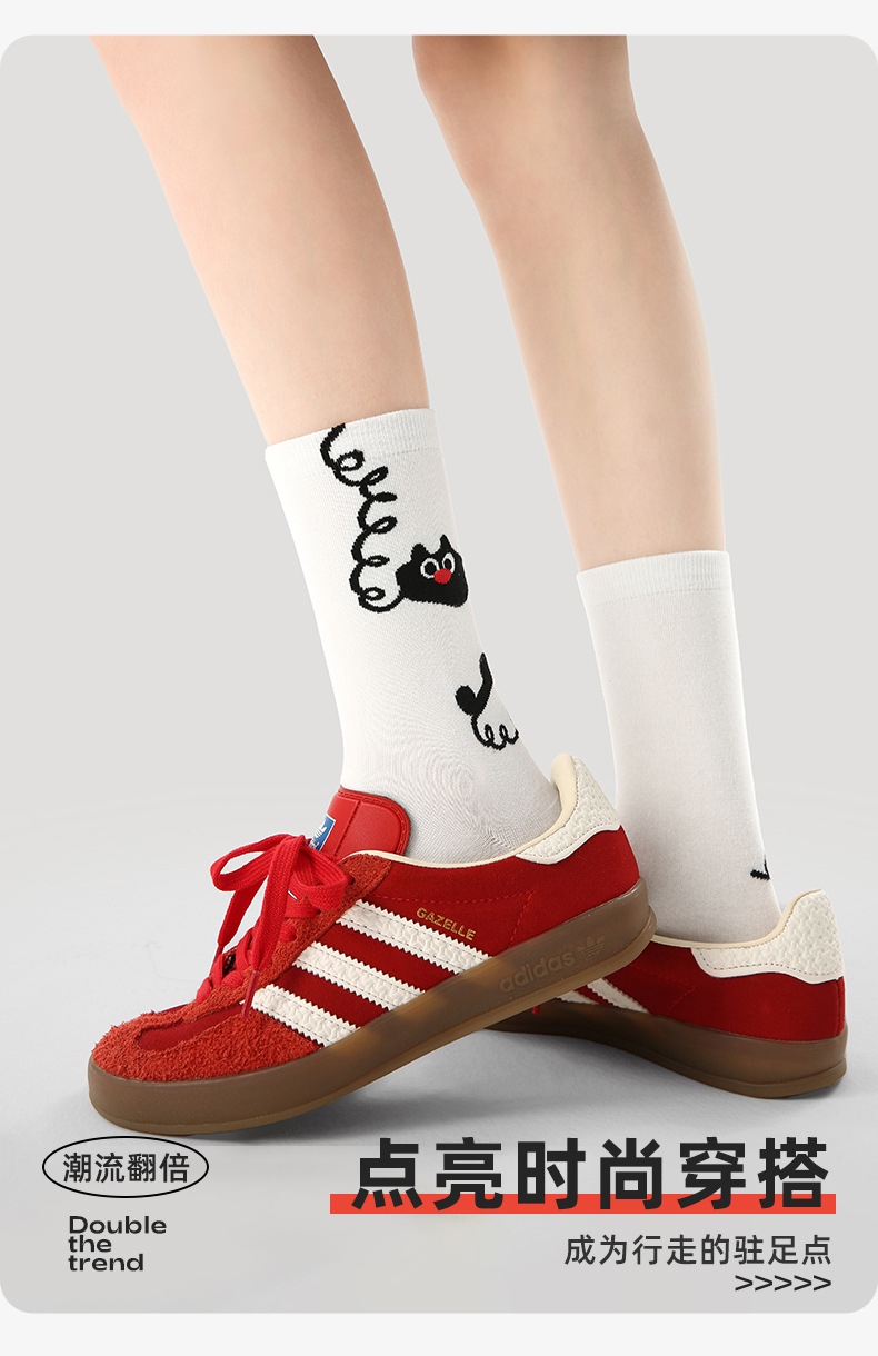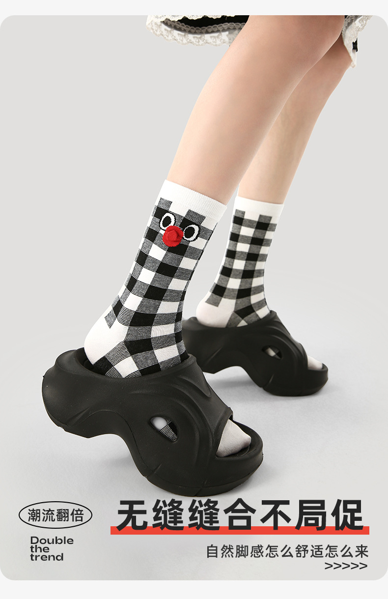 原创女袜春夏季黑白格子中筒袜卡通猫咪精梳棉袜子女