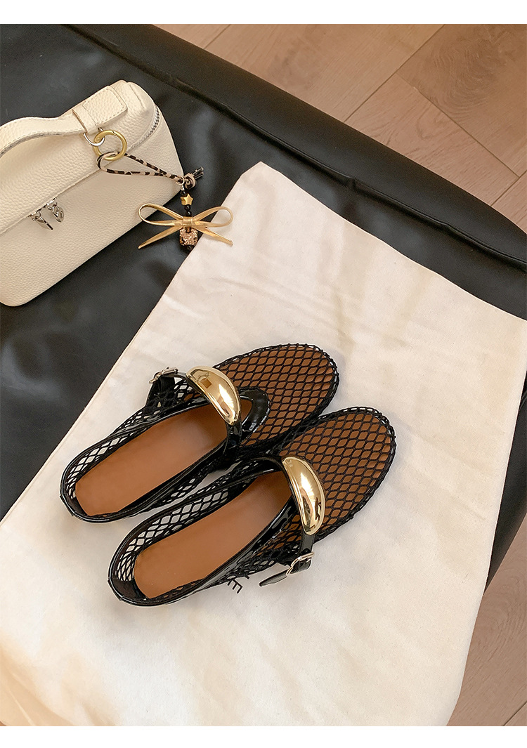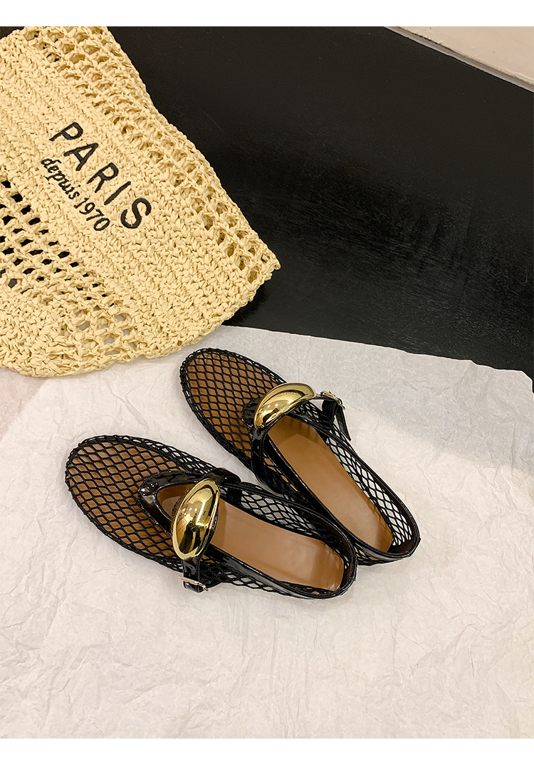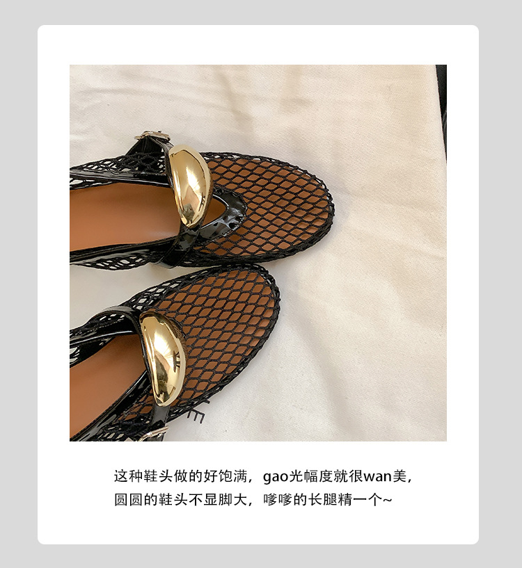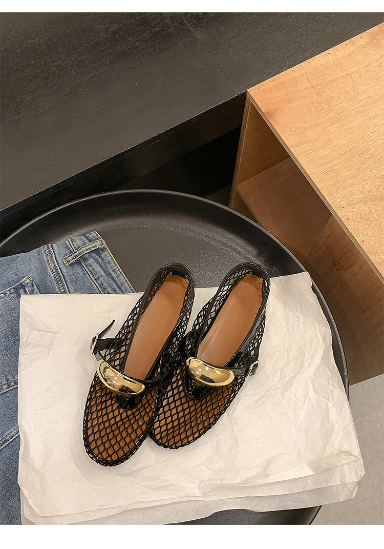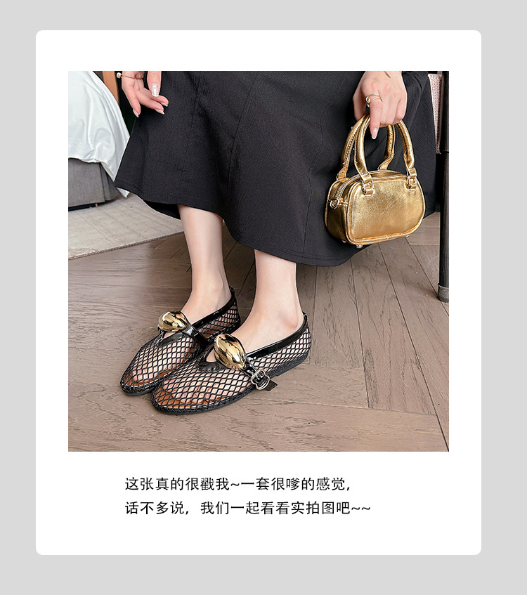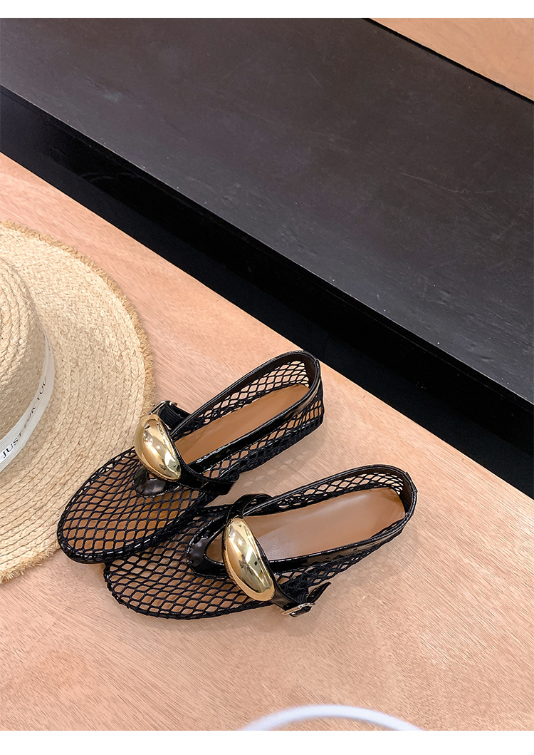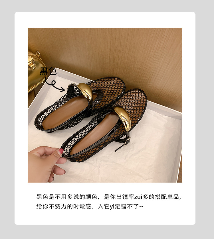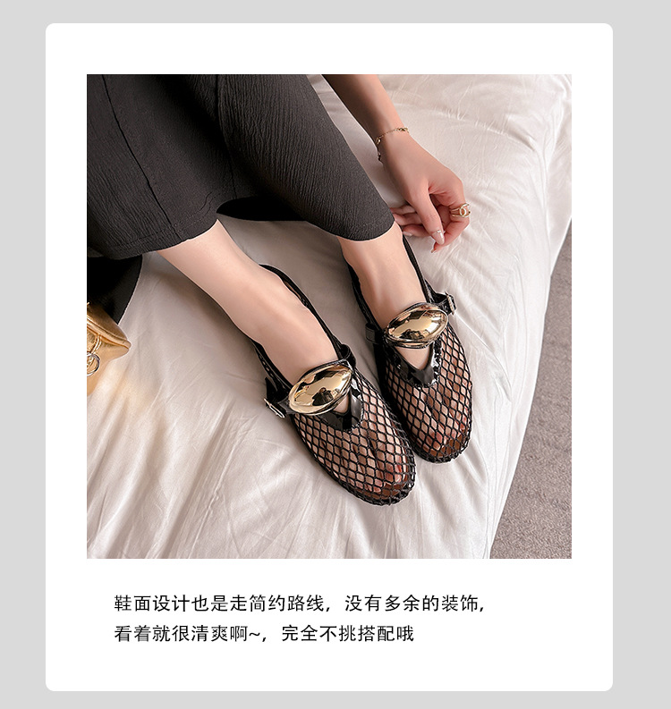 欧美时尚镂空网面凉鞋女夏季新款金属扣圆头平底浅口玛丽珍单鞋