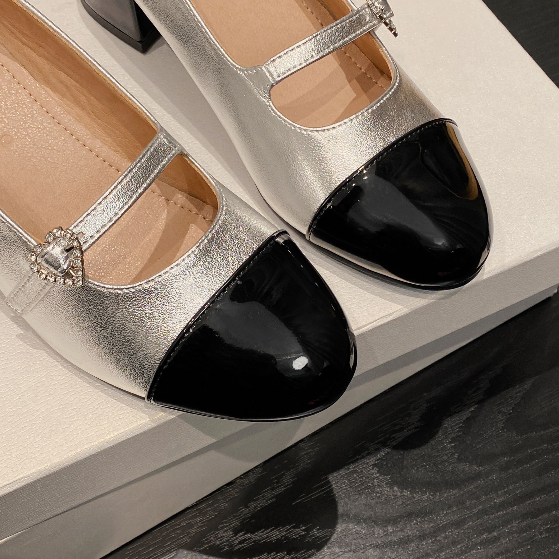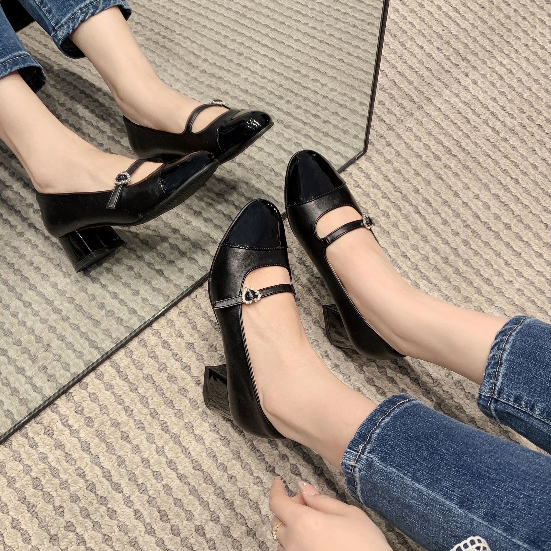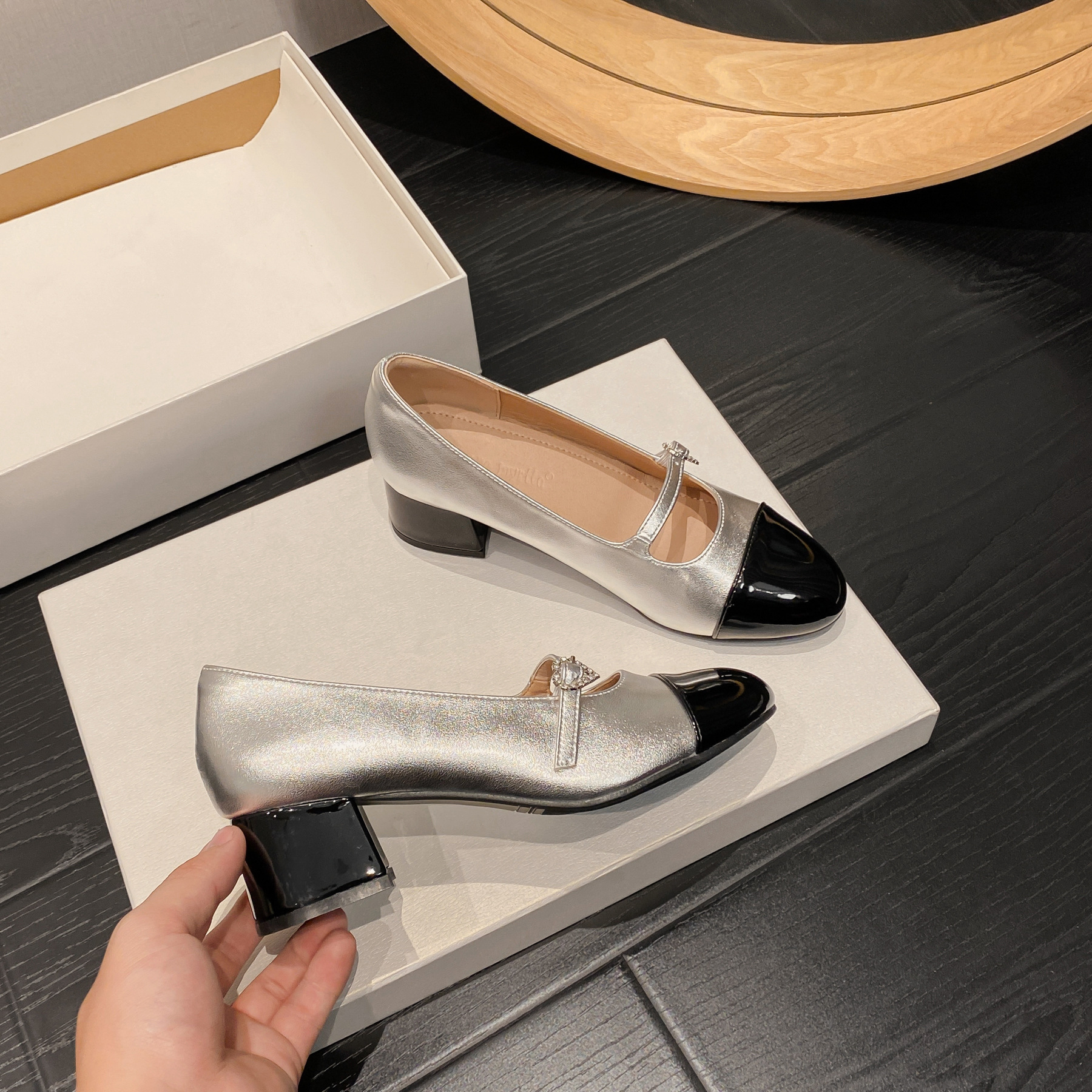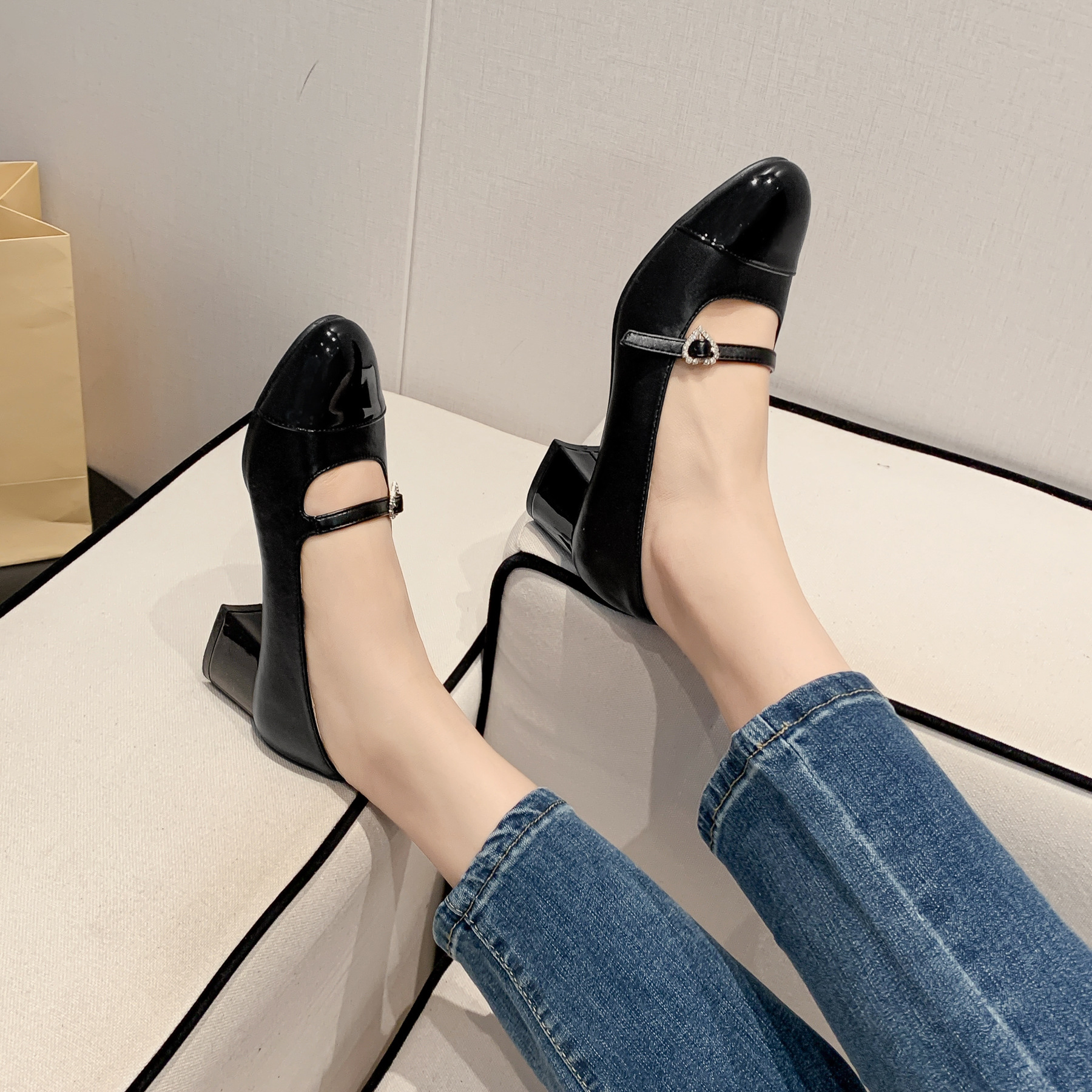 PANDA EYES 法式小香风拼色玛丽珍鞋女春季新款浅口一字扣带粗跟单鞋