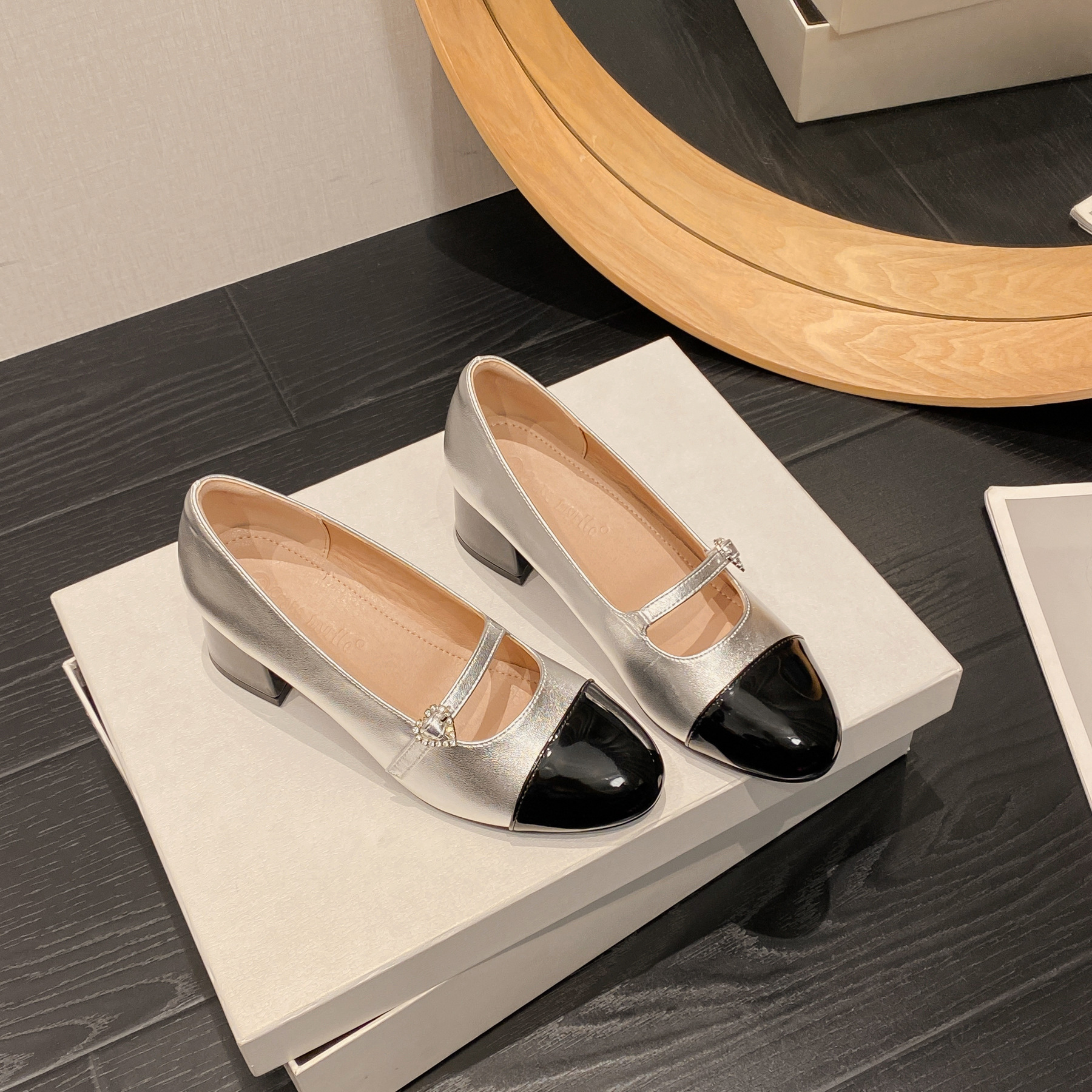现货秒发!葡萄妈同款鞋miu家英伦风真皮拼色尖头后空高跟凉鞋
