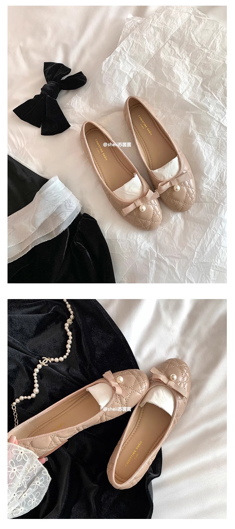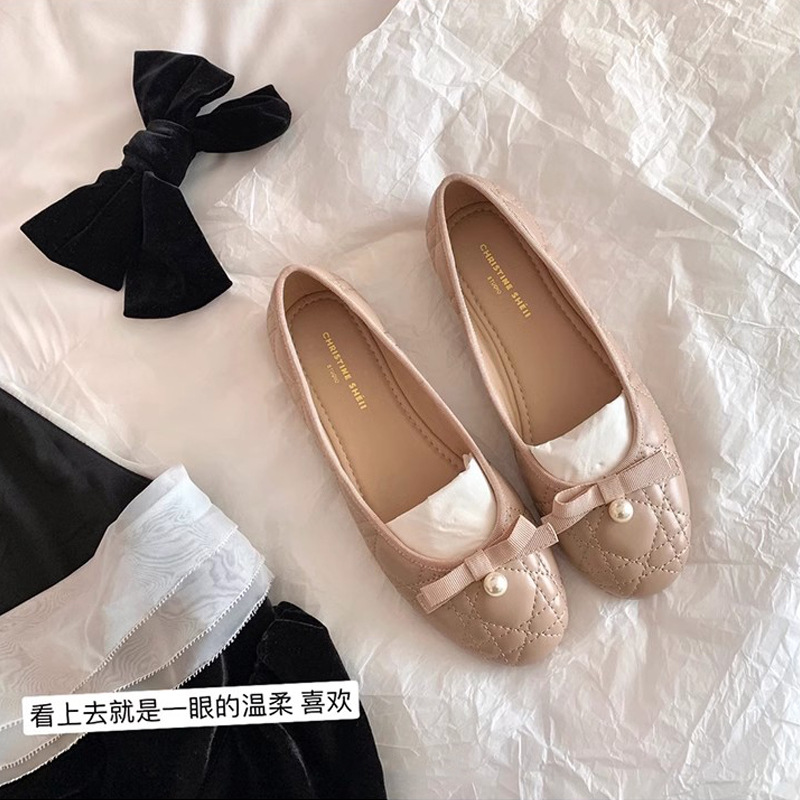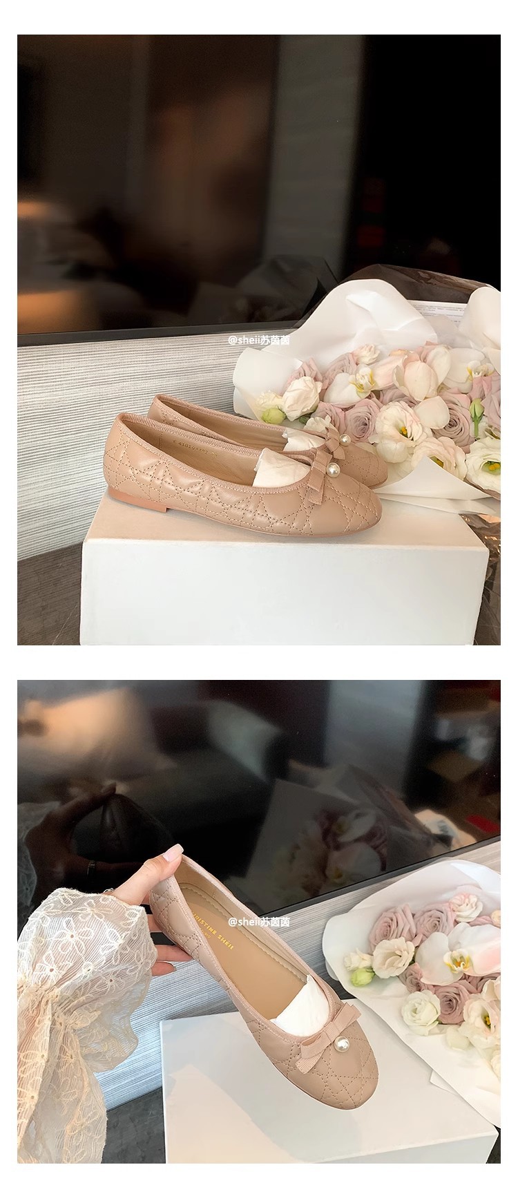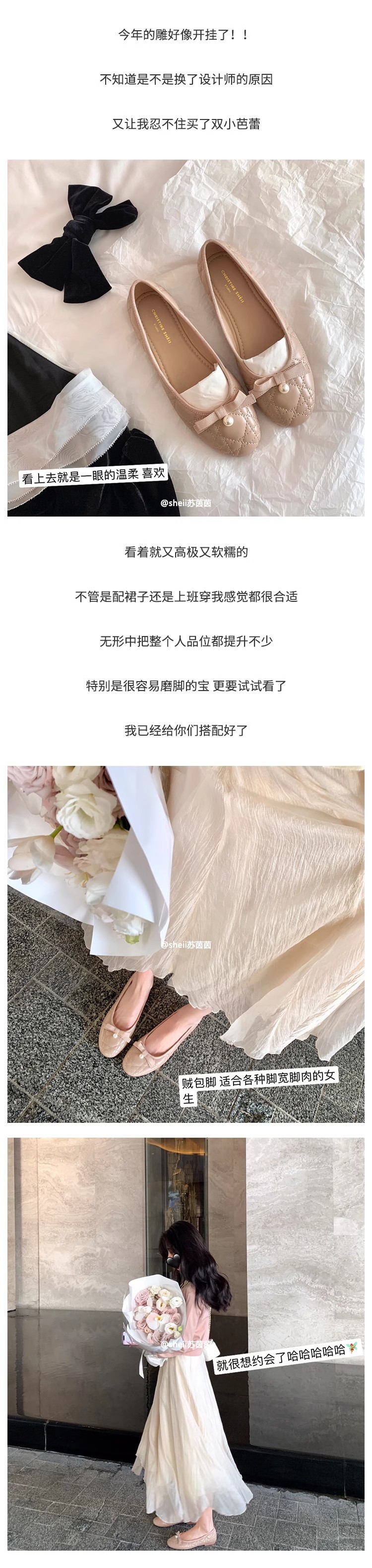 苏茵茵同款花漾小姐~甜美蝴蝶结小羊皮菱格珍珠平底单鞋芭蕾鞋女