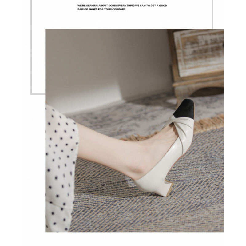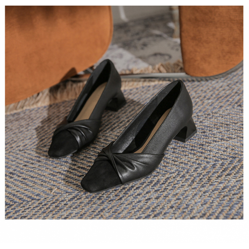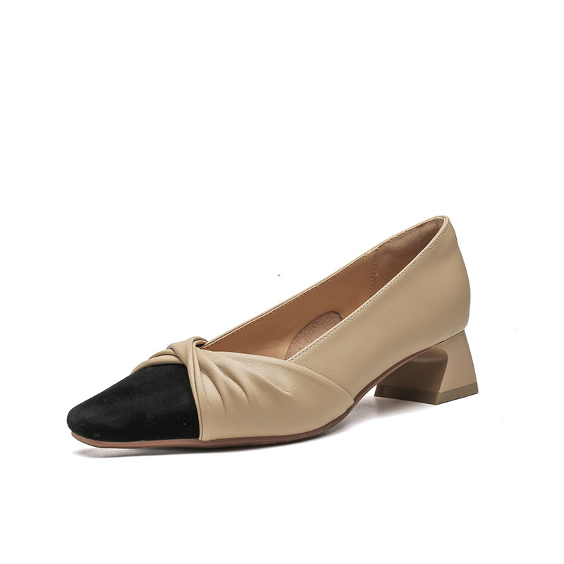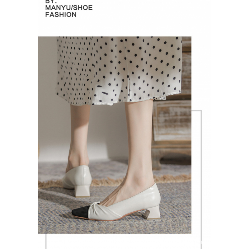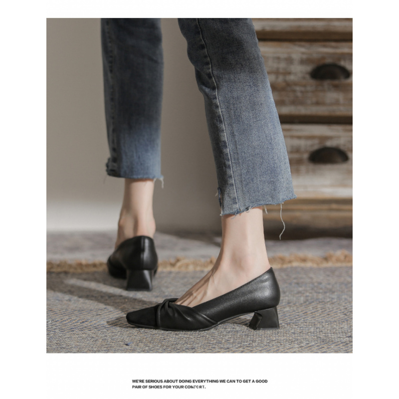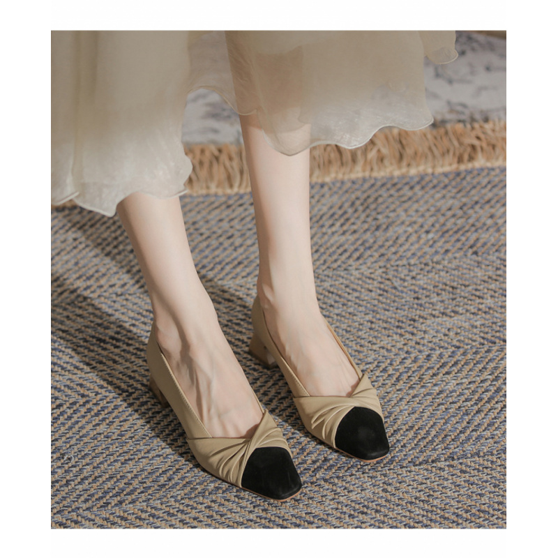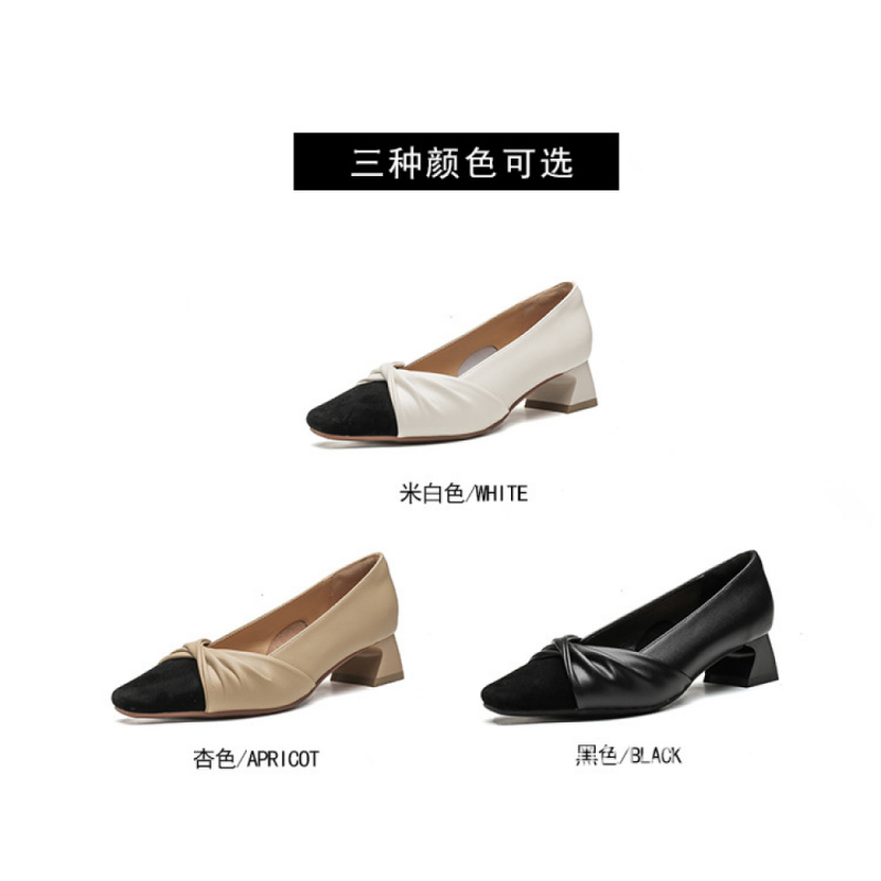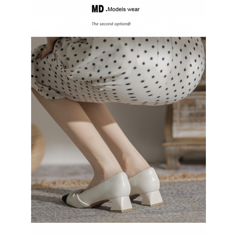 苏茵茵款羊皮版~复古方头粗跟浅口羊皮晚风温柔法式高跟鞋小香风单鞋女春