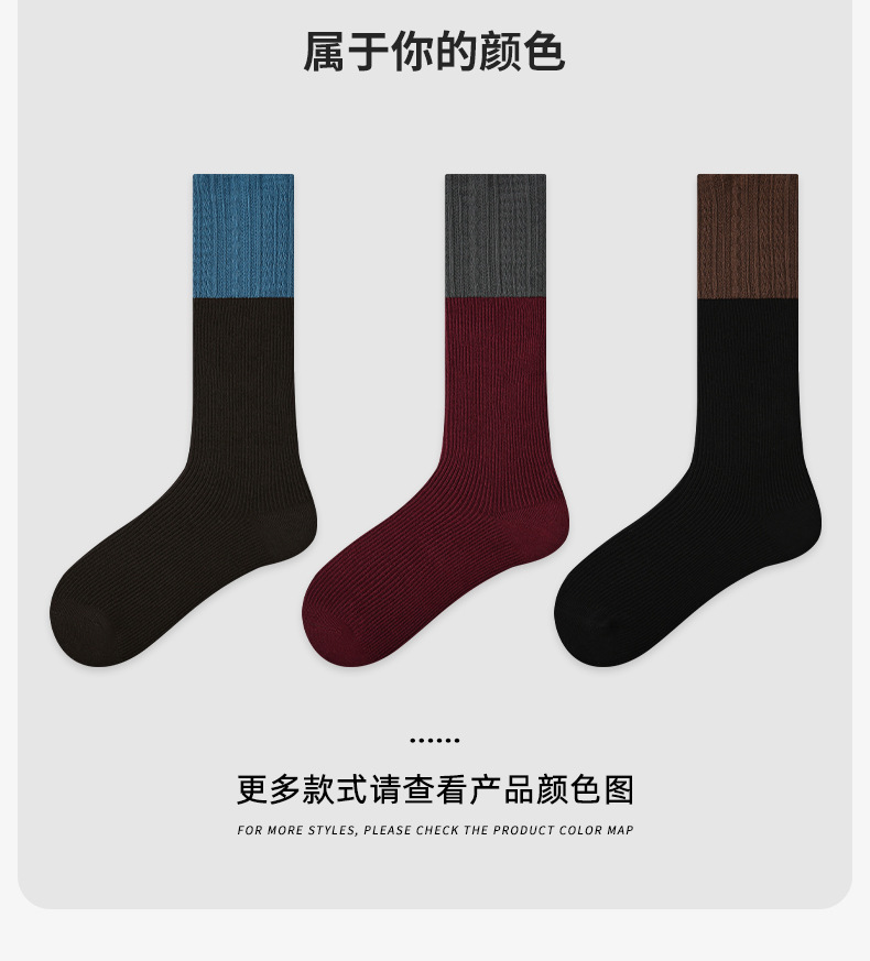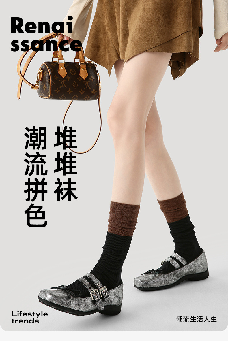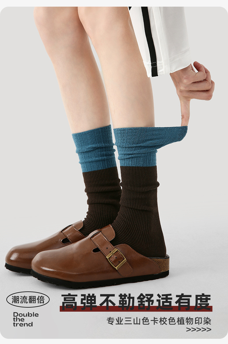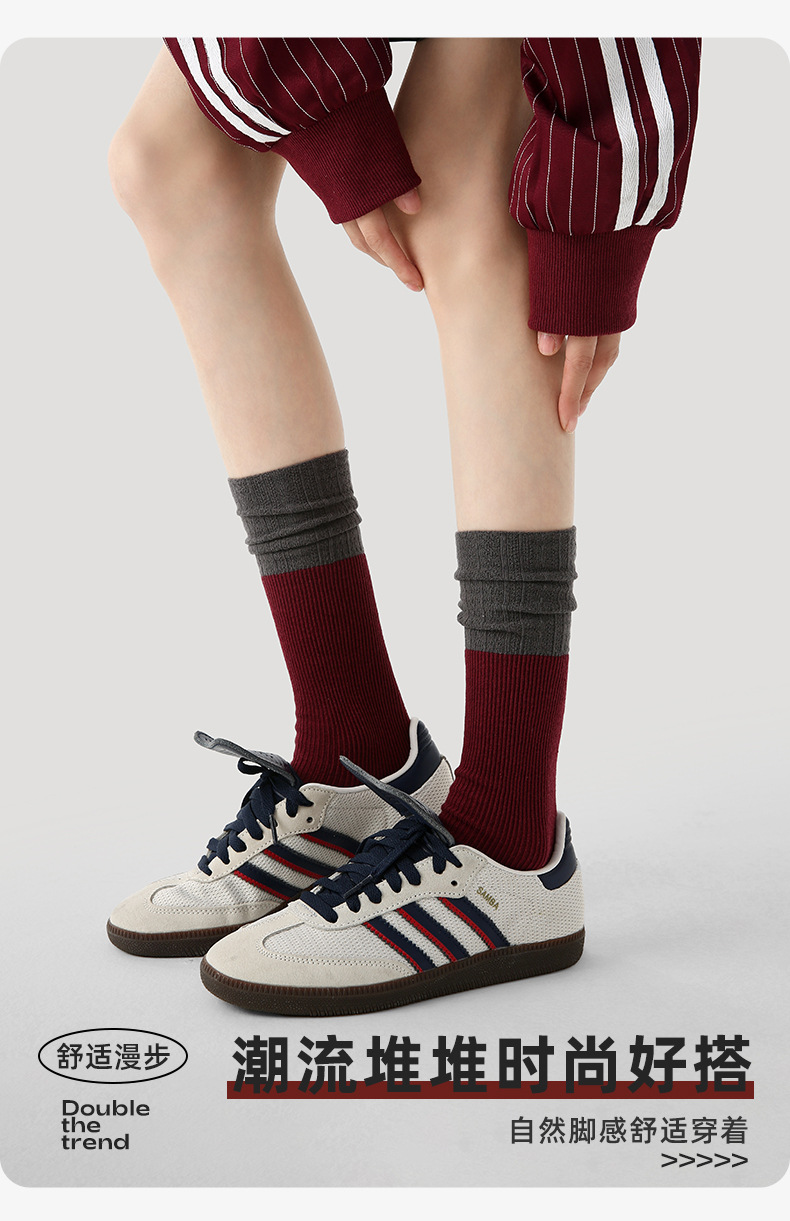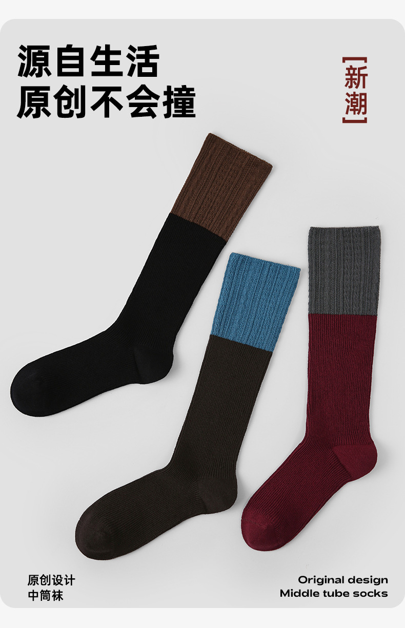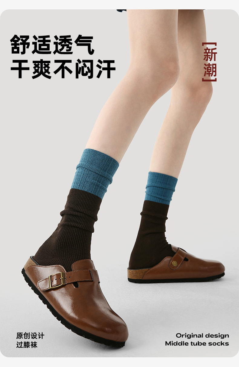 原创女袜秋冬中筒袜无骨堆堆袜拼色细纹简约ins袜子女